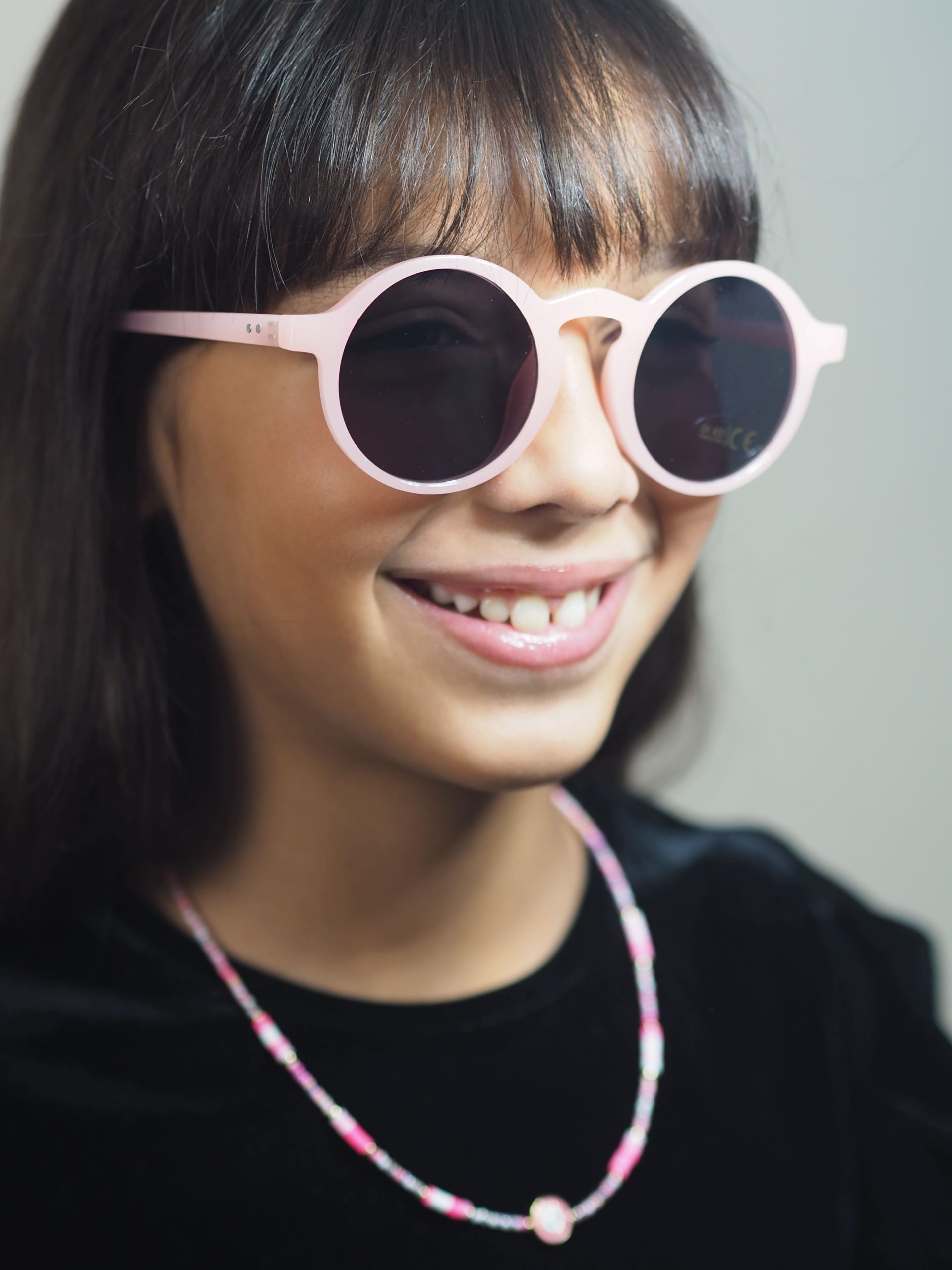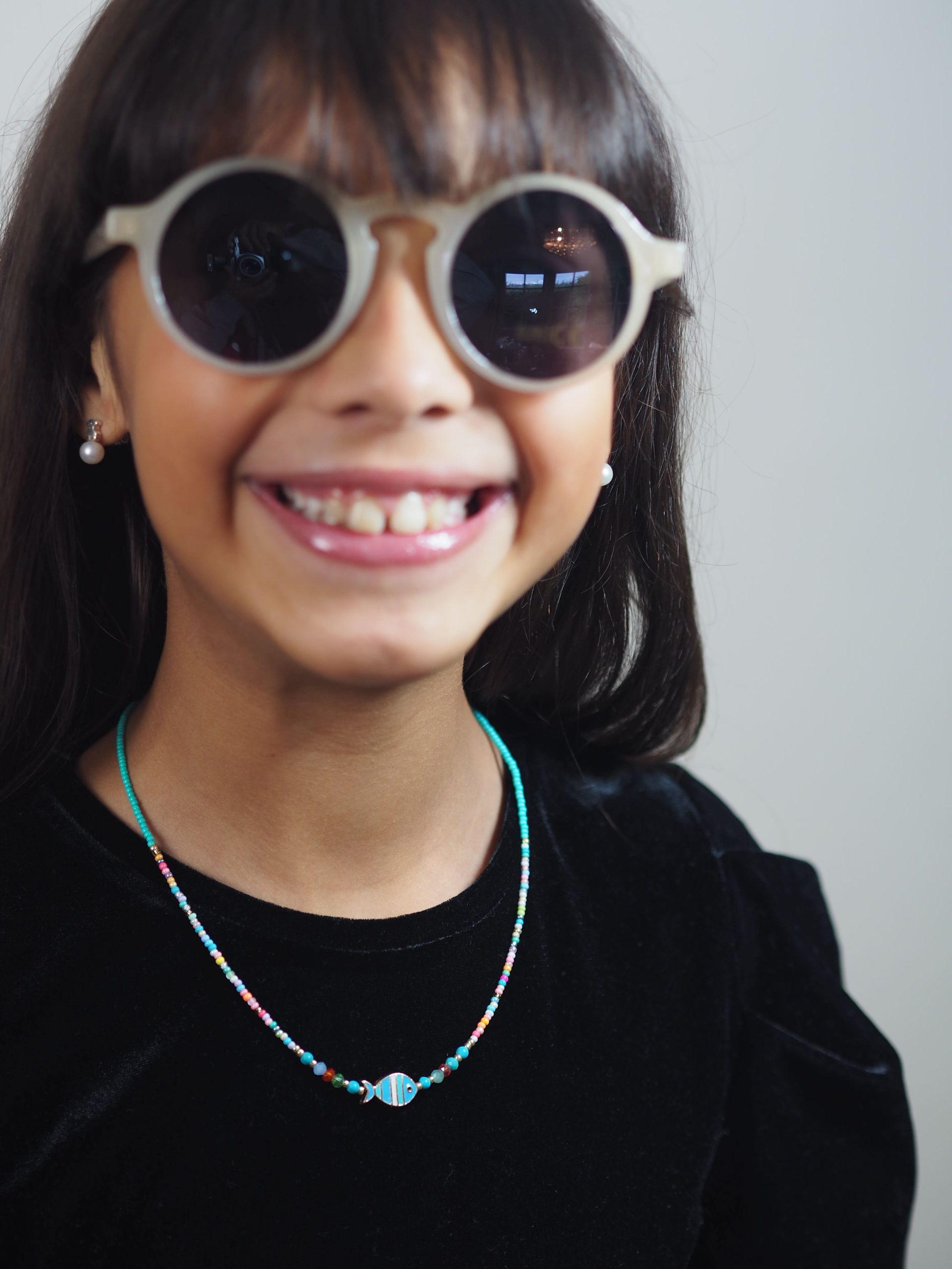 Colgante en piedras de color azul, blanco y dorado colocando en el medio una piedra circular preciosa que combina perfectamente con cualquier oufit de nuestros pequeños.
